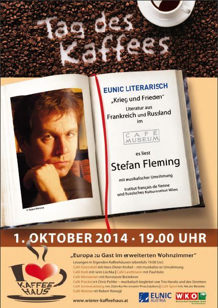 Die europäischen Kulturinstitute luden auch 2014 wieder am Tag des Kaffees wieder zu Lesungen in Wiener Kaffeehäusern ein. Dieses Jahr haben das russische Kulturinstitut und das Insitut français Stefan Fleming eingeladen Texte zum Thema "Krieg und Frieden" erklingen zu lassen.