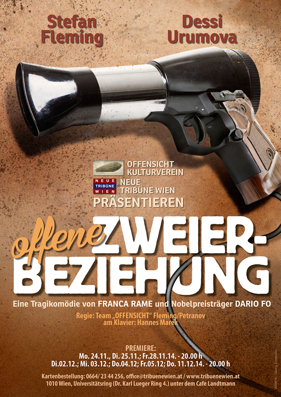 Nach der erfolgreichen Adaption "Sex ohne Zucker" für das Dramatheater in Plovidv (BG) setzte das Regisseursduo OFFENSICHT (Stefan Fleming und Boris Petranov) vor Kurzem die Tragikomödie "Offene Zweierberziehung" von Franca Rame und Dario Fo in Wien in Szene. Was ist eine "Offene Zweierbeziehung"? Der Versuch des Mannes die Frau von der Legitimität des Seitensprungs zu überzeugen? Der Versuch der Frau sich sowohl die Sicherheit der festen Beziehung wie auch das Abenteuer der Untreue gönnen zu wollen? Oder der erste Versuch des Neoliberalismus seine Glaubenssätze auf zwischenmenschliche Beziehungen zu übertragen? In acht bejubelten Vorstellungen standen Dessi Urumova und Stefan Fleming - musikalisch begleitet von Hannes Marek - in der Neuen Tribüne Wien auf der Bühne. |